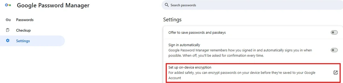 - Tap Google Password Manager > Settings > On-device encryption.